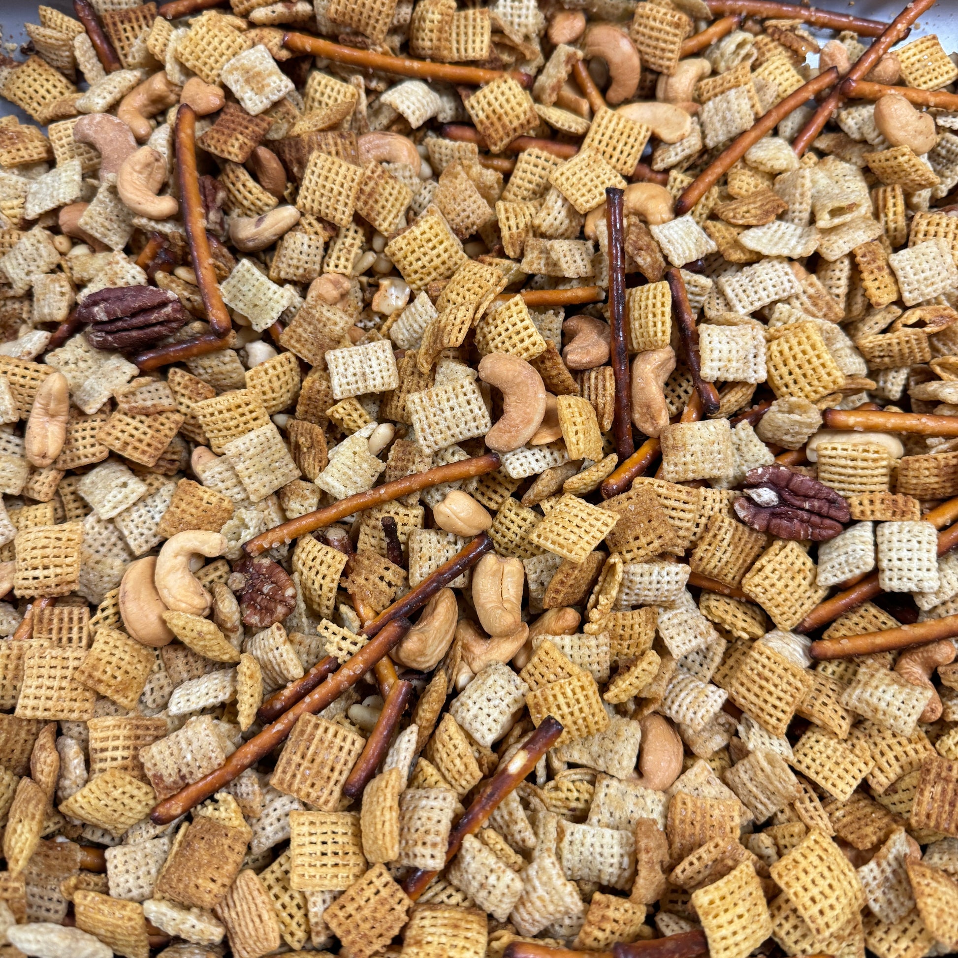 Chex, pretzels, and a variety of nuts are tossed with butter and seasonings.